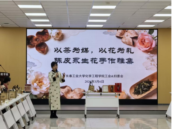 (通讯员:王璐)在2026年“三八”国际妇女节来临之际,化学工程学院工会委员会精心策划并举办了主题为“以茶为媒,以花为礼——陈皮永生花手作雅集”的活动,以此致敬学院全体女教职工,传递深切的关怀与节日的祝福。学院班子全体成员及长春市茶艺师协会会长迟岩峰作为嘉宾出席了本次活动。